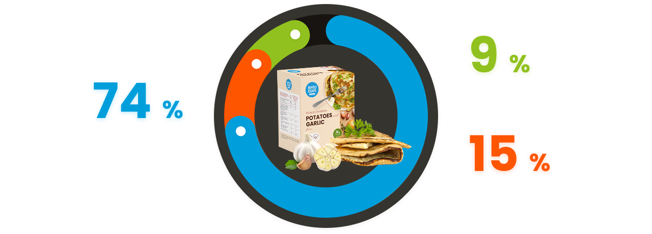 Zloženie: Bielkovinová zmes (68 %) [sójový bielkovinový izolát, mliečny bielkovinový koncentrát, sušené vaječné bielky, srvátkový bielkovinový koncentrát (emulgátor: slnečnicový lecitín)], sušené zemiaky (13 %), stabilizátor: polydextróza; granulovaný cesnak, kvasničný extrakt, jedlá soľ, sušený neztužený slnečnicový tuk (glukózový sirup, mliečny proteín), kypriaci prášok (regulátor kyslosti: vínny kameň, kypriaca látka: jedlá sóda, nosič: kukuričný škrob), protihrudkujúca látka: oxid kremičitý; majorán, zahusťovadlo: karboxymetylcelulóza.