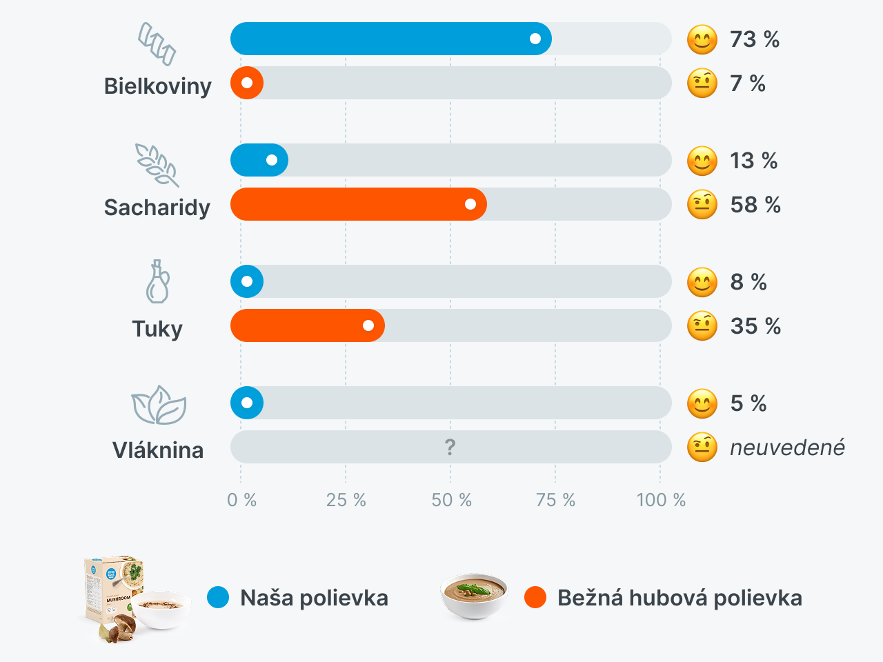 Zloženie: Bielkovinová zmes (66,5 %) [srvátkový proteínový koncentrát (emulgátor: slnečnicový lecitín), mliečny proteínový koncentrát, sójový proteínový izolát]; inulín, kvasinkový extrakt, sušený zeleninový vývar [jedlá soľ, sušená zelenina (pór, mrkva, karfiol, paradajka, hrachová múka, špargľa), cukor, zemiakový škrob, hubový prášok, zmes sušených bylín, repkový olej, zmes korenia]; zmes hríbovitých húb, sušená zelenina (petržlen, cibuľa, zeler koreň, cesnak, petržlen koreň, kapusta, ligurček), ryžový škrob, zahusťovadlo: xantánová guma; protihrudkujúca látka: oxid kremičitý; hubová aróma, petržlenová vňať.