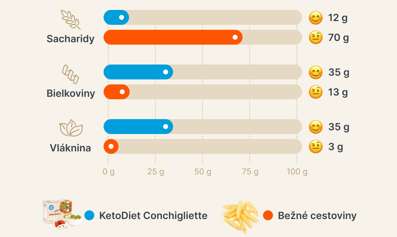 Conchigliette – cestoviny sušené s vysokým obsahom bielkovín a vlákniny, s nízkym obsahom cukrov.