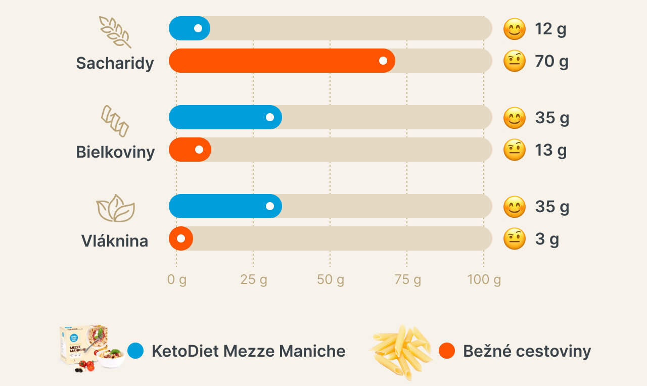 Mezze Maniche – cestoviny sušené s vysokým obsahom bielkovín a vlákniny, s nízkym obsahom cukrov.