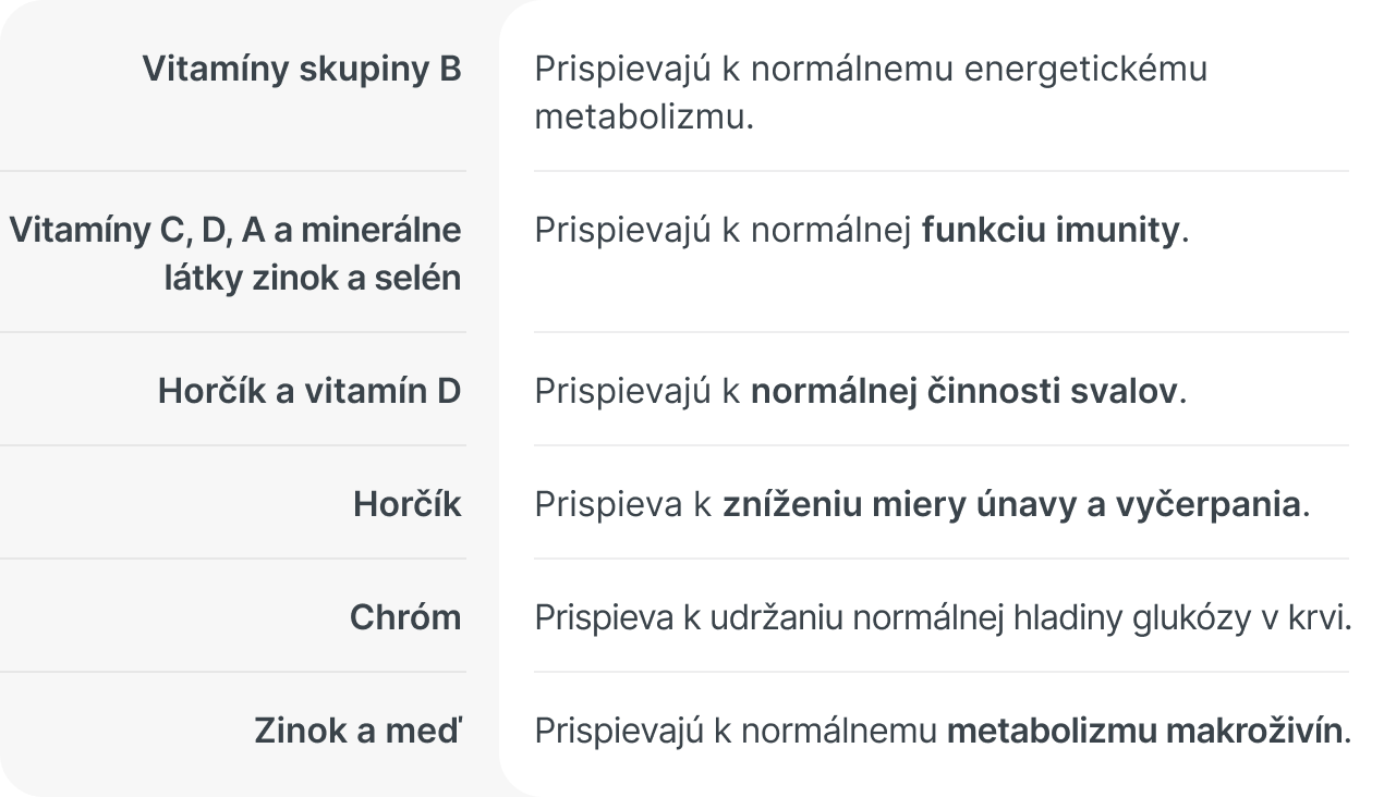 * % denné referenčné príjmy vitamínov a minerálnych látok (dospelí).